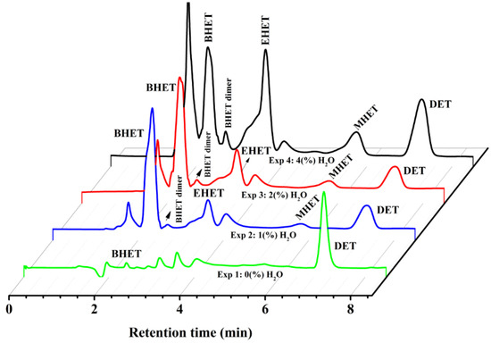 Chromatograms obtained through HPLC for the products originated from each run, as described in Table 1, are shown in Figure 1. The characteristic peaks on Figure 1 assigned to bis-(hydroxyethyl) terephthalate (BHET), mono-(hydroxyethyl) terephthalate (MHET), and diethyl terephthalate (DET) [9] are observed at retention times ranging from 2.0–2.5 min, 5.5–6.0 min, and 6.9–7.4 min, respectively, for the products obtained from experiments carried out in the presence of water (exp2, exp3, and exp4). Additionally, the chromatogram of the products from exp1 does not show the peak assigned to MHET (retention time 5.5–6.0 min). In contrast, on the chromatograms of the products from exp2, exp3, and exp4, the peak assigned to MHET increased in intensity as the amount of water is higher. The peak assigned to BHET (2.0–2.5 min) in the chromatogram of the products from exp1 had a lower intensity as compared to the chromatograms of the products from experiments performed in the presence of water (exp2, exp3, and exp4). Therefore, it is clear that the presence of water favours MHET and BHET formation and decreases the amount of DET formed.