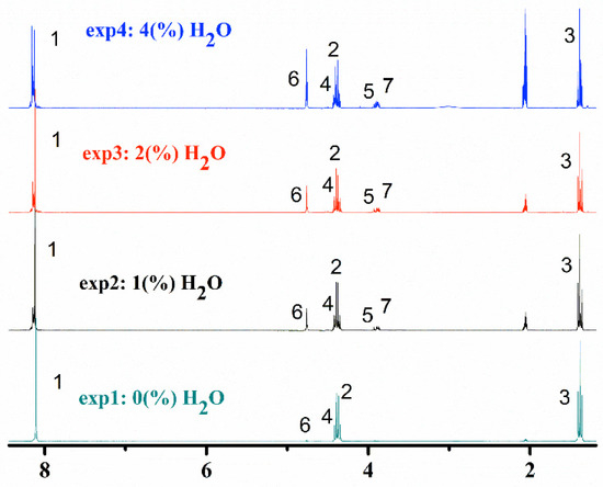 Figure 3 shows the 1H-NMR spectra recorded for the products from exp1 to exp4. Except for the spectrum for the products from exp1, all the others show a common signal at 3.9 ppm (denoted as signal 5), which was assigned to the hydrogen of the hydroxyl group of MHET. As mentioned before, the presence of MHET in the products from exp2 to exp4 was inferred after observing signal 6 at the retention time range 5.5–6.0 min in the chromatograms (Figure 1) for the products of these runs. Additionally, the intensity of the signal observed at 3.9 ppm increased as the amount of water present in the PET depolymerization reaction is raised. This same observation was made after comparison of the chromatogram of the products from exp1 to those from exp2 to exp4 (Figure 1). In other words, the data from 1H-NMR match very well to the data obtained by HPLC. The other signals were attributed to: (i) H-atoms on the aromatic ring (signal 1, at 8.1 ppm); (ii) H-atoms on the ethoxyl groups (signals 2 and 3, at 4.3 and 1.38 ppm, respectively); and (iii) -CH2-OH groups of BHET (signal 7, at 3.8 ppm) and -CH2-O groups of BHET (signal 4, at 4.5 ppm).
