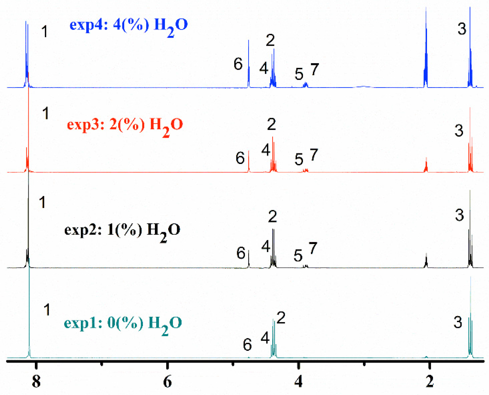 1H-NMR spectra recorded from the products of exp1, exp2, exp3, and exp4 (acetone-D6, 300 MHz).