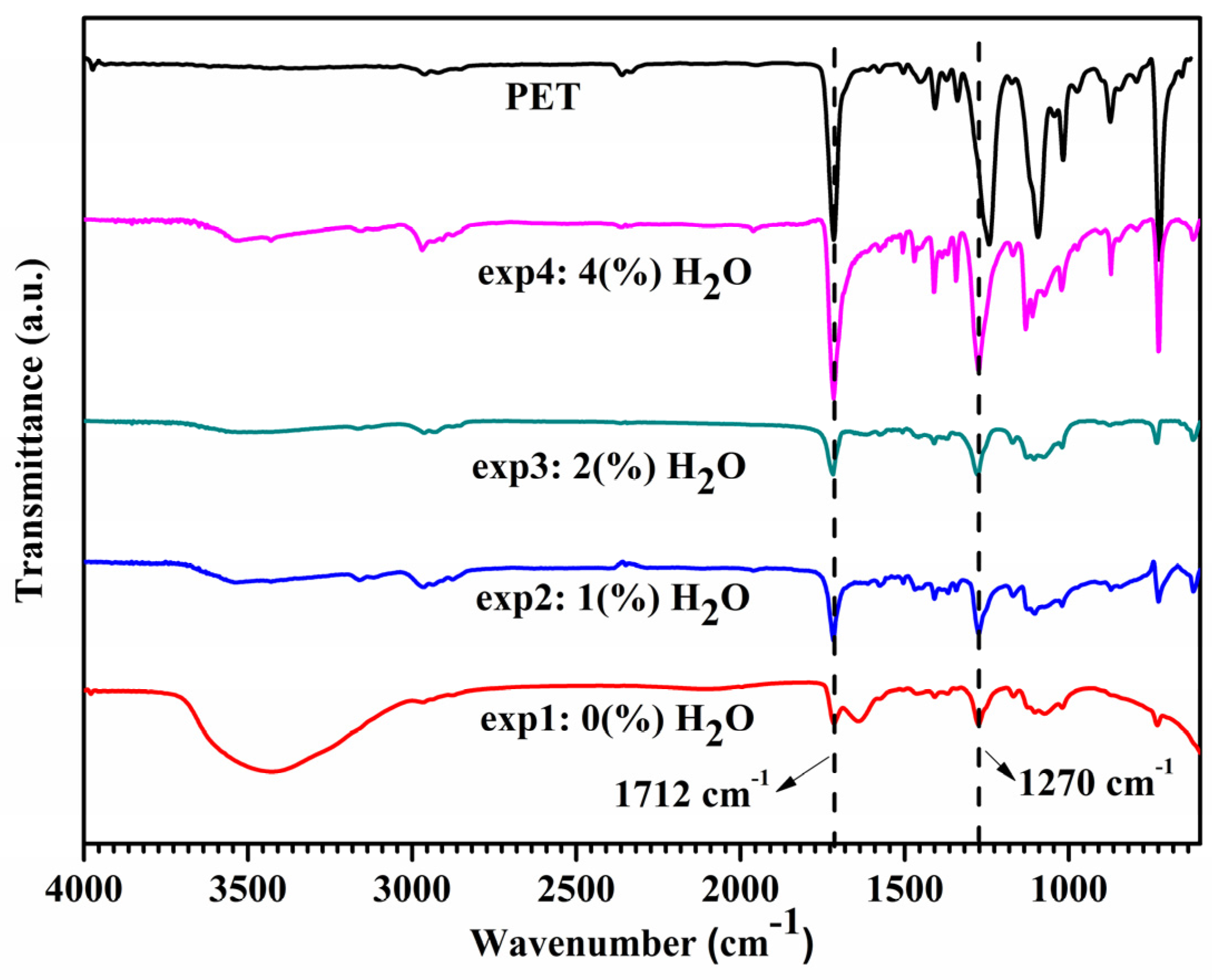 The as-obtained FTIR spectra are presented in Figure 4 and, for sake of comparison, the FTIR spectrum of PET is also presented. The broad band present in all spectra (exp1 to exp4 but more intense in the spectrum of the products from exp1) was assigned to hydroxyl vibration (–OH). Such a fact indicates the presence, even in low quantity, of hydroxylated compounds such as the BHET monomers in the products from runs exp1 to exp4. As determined through quantitative analysis using HPLC, the high concentration of DET (98%) in the products from exp1 indicates the presence of a low amount of hydroxylated compounds that may interact through the presence of intra- or intermolecular hydrogen bonds. The band at 1403 cm−1 was assigned to the vibration stretching of the aromatic ring. The bands at 1712 and 1270 cm−1, observed in all spectra (exp1 to exp4), indicate the presence of C=O and C–O bonds, respectively; however, the intensities of such bands changed as the amount of water in the reaction system is altered. Another important aspect to be noticed is the presence of a strong absorption band at 720 cm−1 in the FTIR spectrum of PET, which was assigned to the –CH2– vibrational mode and is indicative of polymeric segments [28]. The presence of such a band was also observed in the spectra from products of exp1 to exp4 (see Figure 4), and the intensity of the band increases as a function of the amount of water. Such behaviour was attributed to the PET fraction (incomplete depolymerization) that remained in the reaction system, which is water dependent. As a consequence, the PET depolymerization reaction in the presence of water is not efficient as in anhydrous conditions and can be denoted as partial. This inference makes sense when the FTIR spectra of PET and of the products from exp4 are compared. Note that the FTIR spectrum of the products from exp4 (where the highest amount of water, 4 wt % related to ethanol was used) presented more characteristic bands of PET than the spectra from others runs (exp1 to exp3). Therefore, the product from exp4 is composed of a considerable amount of unreacted or partially depolymerized PET.