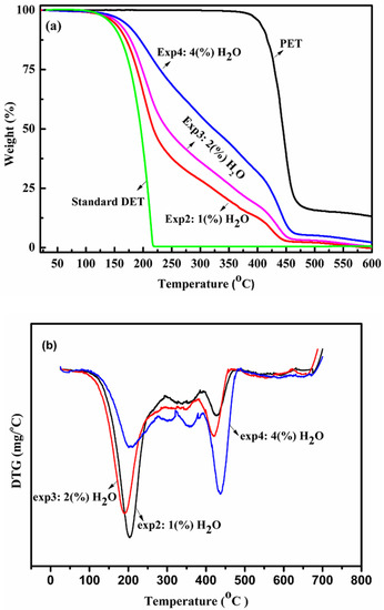 Thermogravimetric analysis TGA (DTG) curves of PET and of the main products from exp2 to exp4 are presented in Figure 5a,b. Similar analyses were carried out with standard DET, for the sake of comparison. The TG curve of PET exhibited significant weight loss (ca. 30%) between 400 and 420 °C, which was assigned to thermal decomposition [27]. The TG curves of the products from exp2 (1% H2O), exp3 (2% H2O), and exp4 (4% H2O) showed clear differences as compared to the TG curve of standard DET. For instance, the TG and DTG curves of products from exp2 and exp3 (see Figure 5a,b) showed two thermal events; the first weight loss starts at 200–220 °C and was attributed to the thermal decomposition of the BHET fraction [29]. The second weight loss starts around 400–420 °C and was due to the thermal decomposition of the PET produced through thermal polymerization during the thermogravimetry analysis [30]. The TG curve of the products from exp4 showed three events. For this curve, the first weight loss starts at 200–220 °C and was attributed to thermal decomposition of the BHET fraction; the second weight loss starts around 250–270 °C and was attributed to the thermal decomposition of the dimers; the third event starts at 320–330 °C and was attributed to the thermal decomposition of other oligomers [29]. The TG curves from the products of exp1 to exp4 are not similar to that obtained for standard DET. The differences were attributed to the presence of water in the reaction vessel, which led the depolymerization reaction to occur only partially. This contributes to the formation of hydroxylated products such as MHET, BHET, and other by-products, for instance dimers and other oligomers; a fact that, obviously, decreases the amount of DET formed.