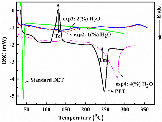 The DSC curve of PET, presented in Figure 6, shows an endothermic peak at ca. 235 °C assigned to the melting of the polymer [31] and an exothermic peak at ca. 132 °C assigned to PET crystallization [31,32]. The intensity of the last peak is sensitive to the aging [32] and to the thermal history [33] of the PET sample. As compared to the DSC curve of standard DET, the DSC curves of the products obtained from exp2, exp3, and exp4 showed clear differences. For instance, the DSC curve of the products from exp4 shows a broad endothermic peak centered at 247 °C, which can be related to the presence of a mixture of higher oligomers and to residues of not depolymerized PET. This profile does not resemble the profile observed for the standard DET. On the other hand, such a broad endothermic peak was not observed in the DSC curves of the products obtained from exp2 and exp3, which showed more similarity to the DSC curve of standard DET. As discussed before, the presence of water in the reaction system diminishes the DET yield. Instead, other hydroxylated by-products are obtained from the PET depolymerization under scEtOH if water is present, even in low amounts. The thermal analyses confirm the data observed by other techniques (HPLC, 1H-NMR, and FTIR).