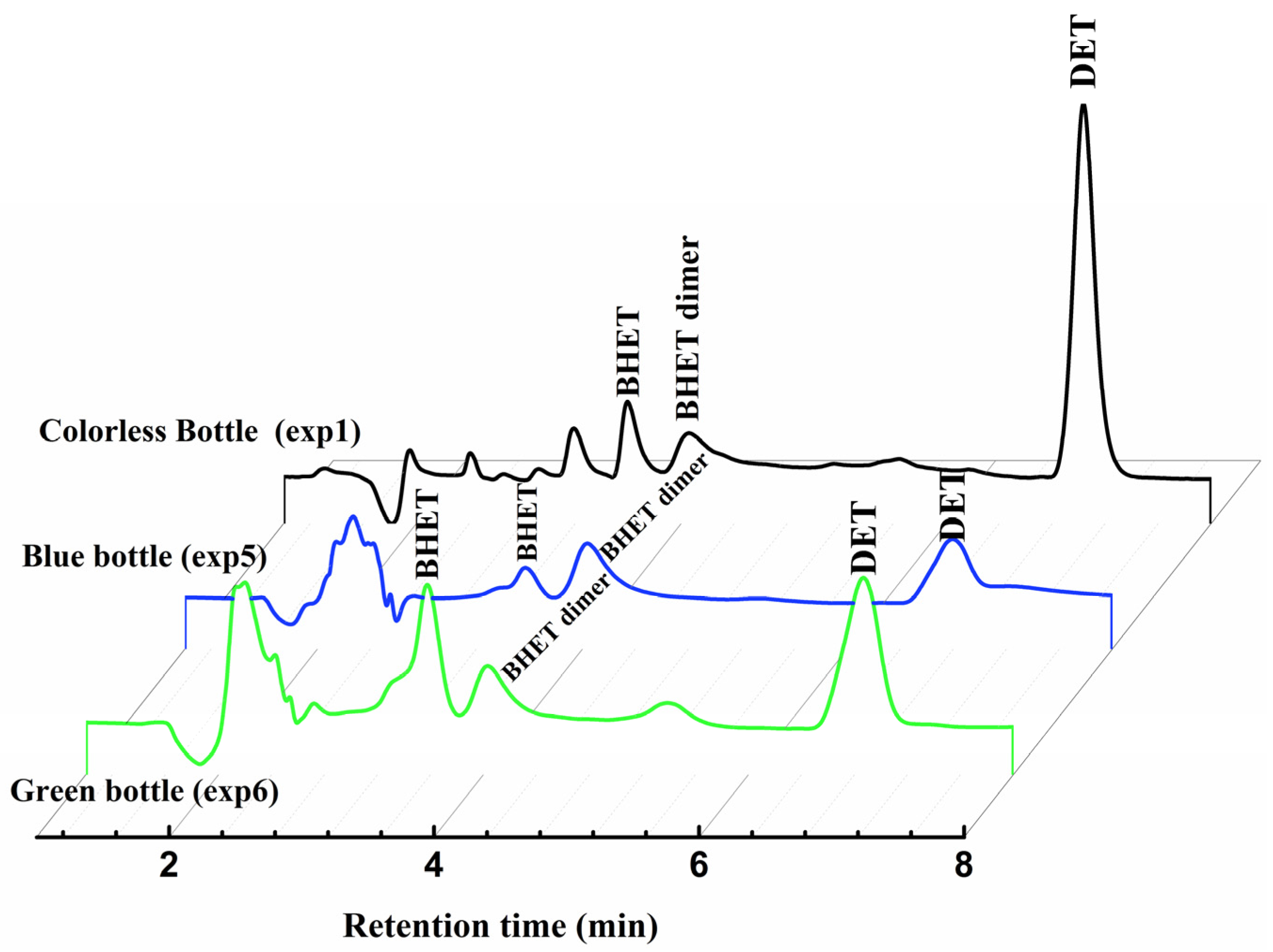 The HPLC chromatograms for the products from runs exp5 and exp6 are shown in Figure 7 and, for the sake of comparison, the chromatogram for the products from exp1 is also shown. The chromatograms of the products from the depolymerization reactions carried out with the coloured PET waste bottles (exp5 and exp6) showed some clear differences as compared to the colourless waste bottles, and the differences also occurred if green or blue bottles were used. The products obtained from exp5 presented more DET in its composition than that obtained from exp6. This demonstrates that such a reaction is strongly influenced by the kind of dye incorporated into the polymer matrix (in the bulk), significantly influencing the yield of the product (DET).