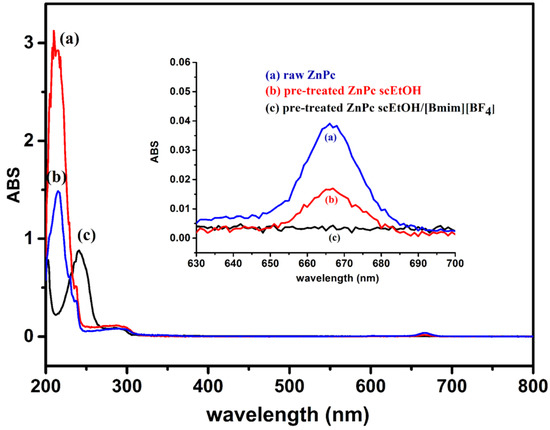 UV-Vis spectrum of (a) raw ZnPc; (b) pre-treated ZnPc in scEtOH; and (c) pre-treated ZnPc in scEtOH with the presence of [Bmim][BF4] (the concentration of ZnPc in each case is 1.978 mg·mL−1).