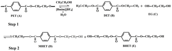 Colourless and coloured (green and blue) PET flakes (averaged larger size c.a. 1 mm), from waste soft drink bottles, were supplied by Plaspet Reciclagens Ltda. (an enterprise located in Maringá, Brazil). Anhydrous ethanol (99.5% GL purity) was supplied by Nuclear (Diadema-SP, Brazil). Diethyl terephthalate (DET) and bis-(hydroxyethyl) terephthalate (BHET), used as standards, were purchased from Sigma-Aldrich (Geel, Belgium NJ, USA). The chemicals used for [Bmim][BF4] synthesis were: N-methylimidazole (99%) (Sigma-Aldrich, St. Louis, MO, USA); 1-chlorobutane (Sigma-Aldrich, St. Louis, MO, USA); acetonitrile (Synth, Diadema, São Paulo, Brazil); dichloromethane (Synth, Diadema, São Paulo, Brazil); and potassium tetrafluoroborate (Sigma-Aldrich, St. Louis, MO, USA). Acetonitrile was distilled over phosphorus pentoxide (P2O5), 1-chlorobutane was used as received, and ethyl acetate (Sigma-Aldrich, St. Louis, MO, USA) was distilled over P2O5 [39].