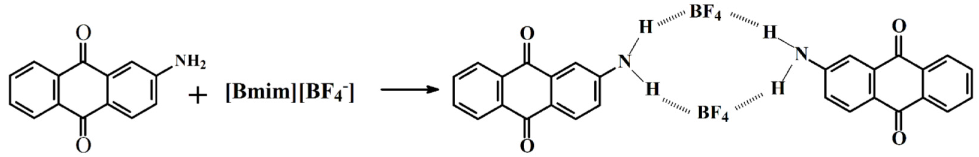 The literature states that the association of IL and dyes is largely dependent to the anionic moiety of IL [34]. The 2-aminoanthraquinone (green dye) may interact with [Bmim][BF4] through H-bonds. Such interactions occur among the amino groups (–NH2) of 2-aminoanthraquinone and the [BF4−] ions, as illustrated in Scheme 2. This scenario limits the catalytic effect of [Bmim][BF4] and, thus, a lesser amount of DET is obtained in the depolymerization reaction in the presence of 2-aminoanthraquinone.