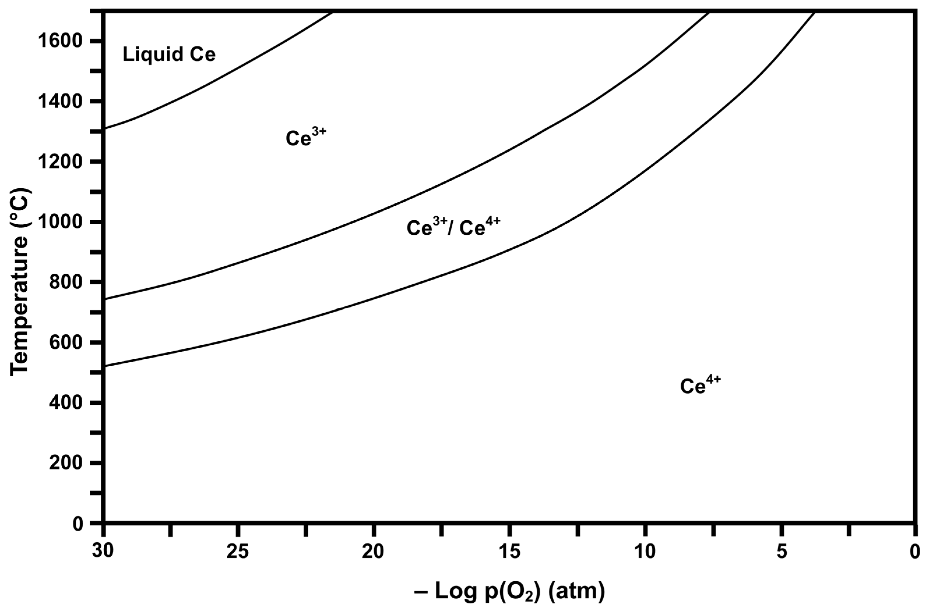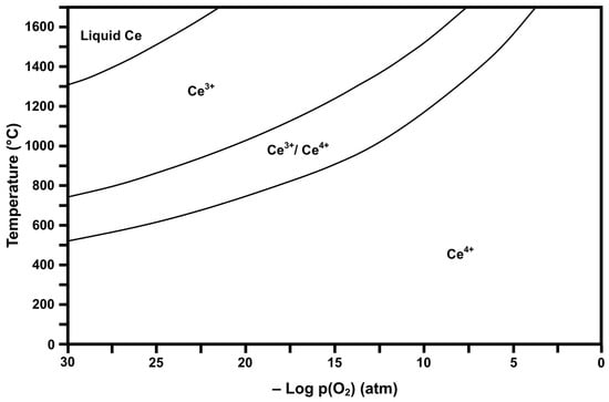 Calculated Ce stability diagram (Ce4+ = CeO2, Ce3+/Ce4+ = Ce3O5 or CeO2·Ce2O3, Ce3+ = Ce2O3).