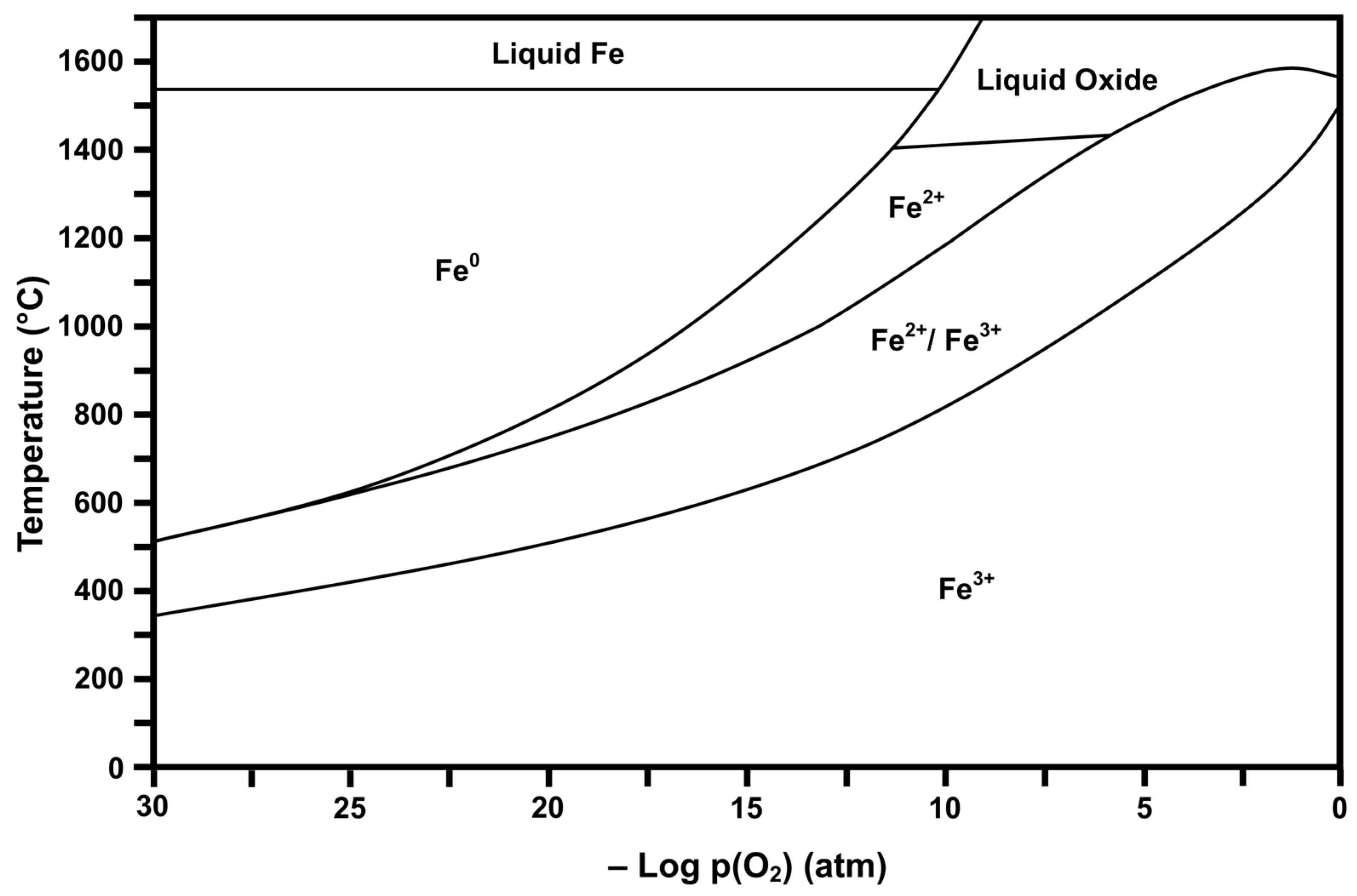 Calculated Fe stability diagram (Fe3+ = Fe2O3, Fe2+/Fe3+ = Fe3O4 or FeO·Fe2O3, Fe2+ = FeO, Fe0 = elemental Fe).