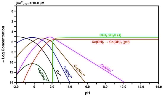 Inspection of the curve for Ce4+ in Figure 4 reveals that, with increasing pH, its concentration decreases rapidly while the concentrations of the species for which there are curve intersections increase. That is, Ce4+ hydrolyzes progressively with increasing pH to form Ce(OH)3+, Ce(OH)22+, Ce(OH)3+, and finally Ce(OH)4. The latter species subsequently undergoes gelation [43], so this is indicated in the curve for this species. This indicates that free Ce4+ cations are relatively unstable and readily attract hydroxyl groups. At a pH of slightly greater than 2.00, solid CeO2·2H2O begins to precipitate. The intersection of the three curves at a pH of ~2.60 shows that solid CeO2·2H2O also precipitates from Ce(OH)3+ at this point. Although Ce(OH)4 also forms from Ce(OH)3+ at this point, the presence of the inflection point for the curve for Ce(OH)4 at this pH suggests that this is the point at which it changes from a solute to a gel. However, the experimental observations concerning the Pourbaix diagram revealed that the equilibria were sensitive to the atmosphere. Under argon, Ce(OH)4 readily precipitated with increasing pH, probably as a gel; in contrast, under air, a mixture of precipitated CeO2·2H2O and gelled Ce(OH)4 formed with increasing pH. Thus, these two species, which are chemically identical, are included in the speciation diagram, even though they are not solutes, so that there is a direct correspondence between the speciation diagram and the experimental observations concerning the Pourbaix diagram. Finally, the speciation diagram shows that the dimerisation of two Ce(OH)3+ species to form dinuclear Ce2(OH)26+ occurs at very low concentrations.