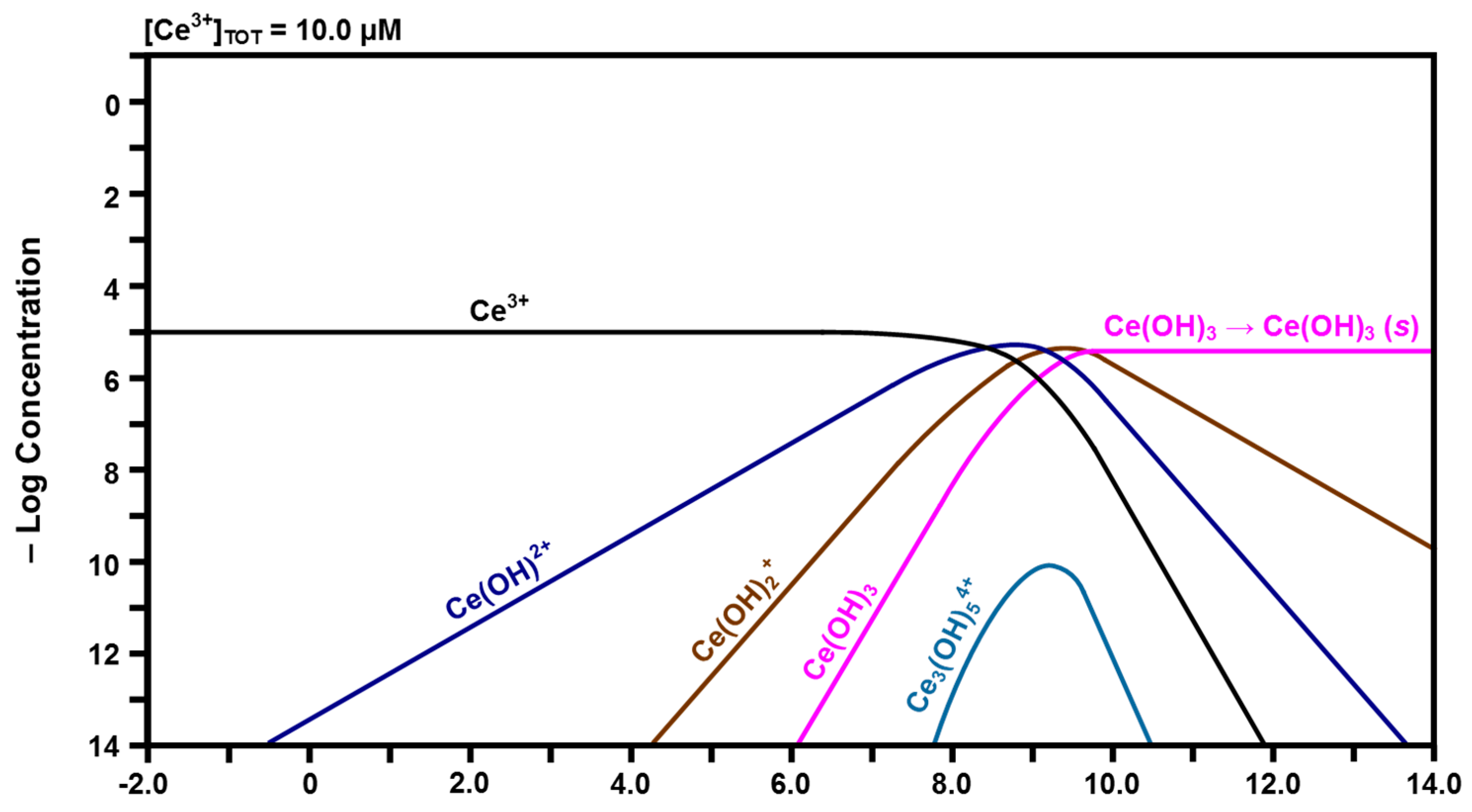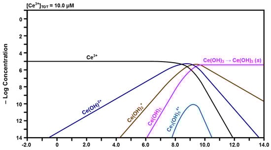 The speciation diagrams for Ce4+-H2O and Ce3+-H2O, which are shown in Figure 4 and Figure 5, respectively, were calculated in order to harmonize with the Pourbaix diagram of Hayes et al. [43]. In many cases, Pourbaix diagrams treat solids and liquids independently (except for the elemental forms). In the present work, soluble species and some precipitates are included together in order to reflect the experimental observations for the Pourbaix diagram of Hayes et al. [43]. The intersection of two species on a speciation diagram corresponds to identical concentrations of both at a given pH (assuming equal activity coefficients).