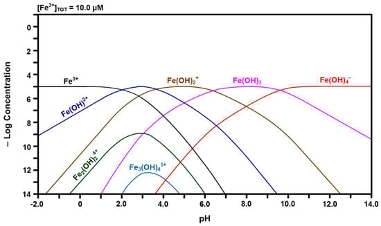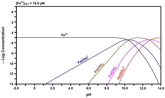 The calculated Fe speciation diagrams are given in Figure 6 and Figure 7. Figure 6 shows that ferric (Fe3+) ions have a pH stability range between that of Ce4+ and Ce3+, followed by a hydrolysis progression over a wide pH range. Dinuclear Fe2(OH)24+ forms from Fe(OH)2+ and trinuclear Fe3(OH)45+ forms from Fe2(OH)24+ + Fe(OH)2+ [50,51]. Figure 7 shows that ferrous (Fe2+) ions have the largest pH stability range of the four cation species, followed by a relatively narrow pH range for the hydrolysis progression. There are no polynuclear species.