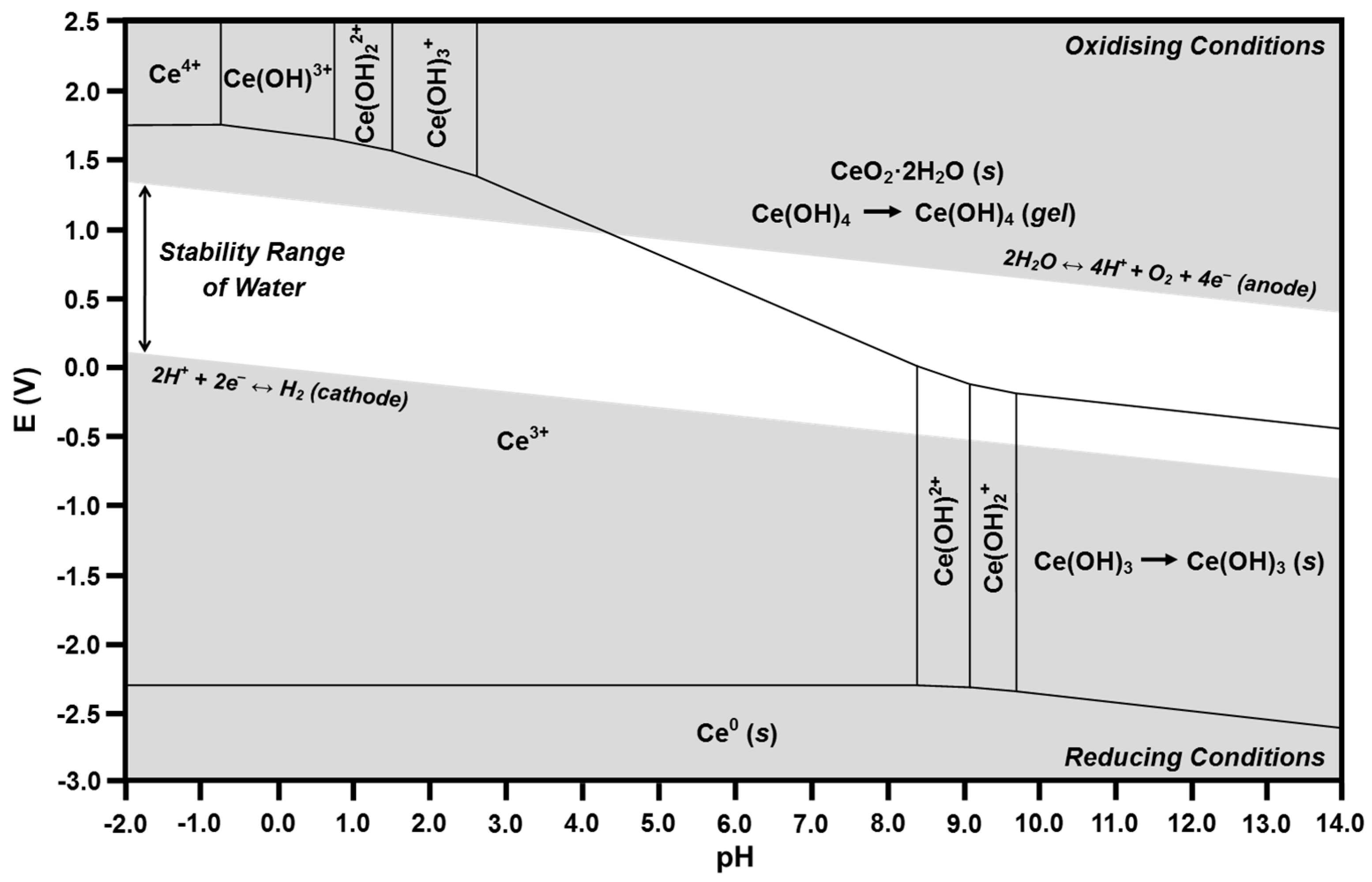 The calculated Ce-H2O and Fe-H2O Pourbaix diagrams are given in Figure 8 and Figure 9, respectively. The relevant part of each diagram is the central white region, which defines the conditions for which water is stable. Since there is no applied potential, a line at E = 0 can be considered to define the general equilibria for the full range of possible pH. However, as discussed previously, there will be deviations from this line owing to localized surface equilibria and whether or not the redox couples are in equilibrium [55,56].