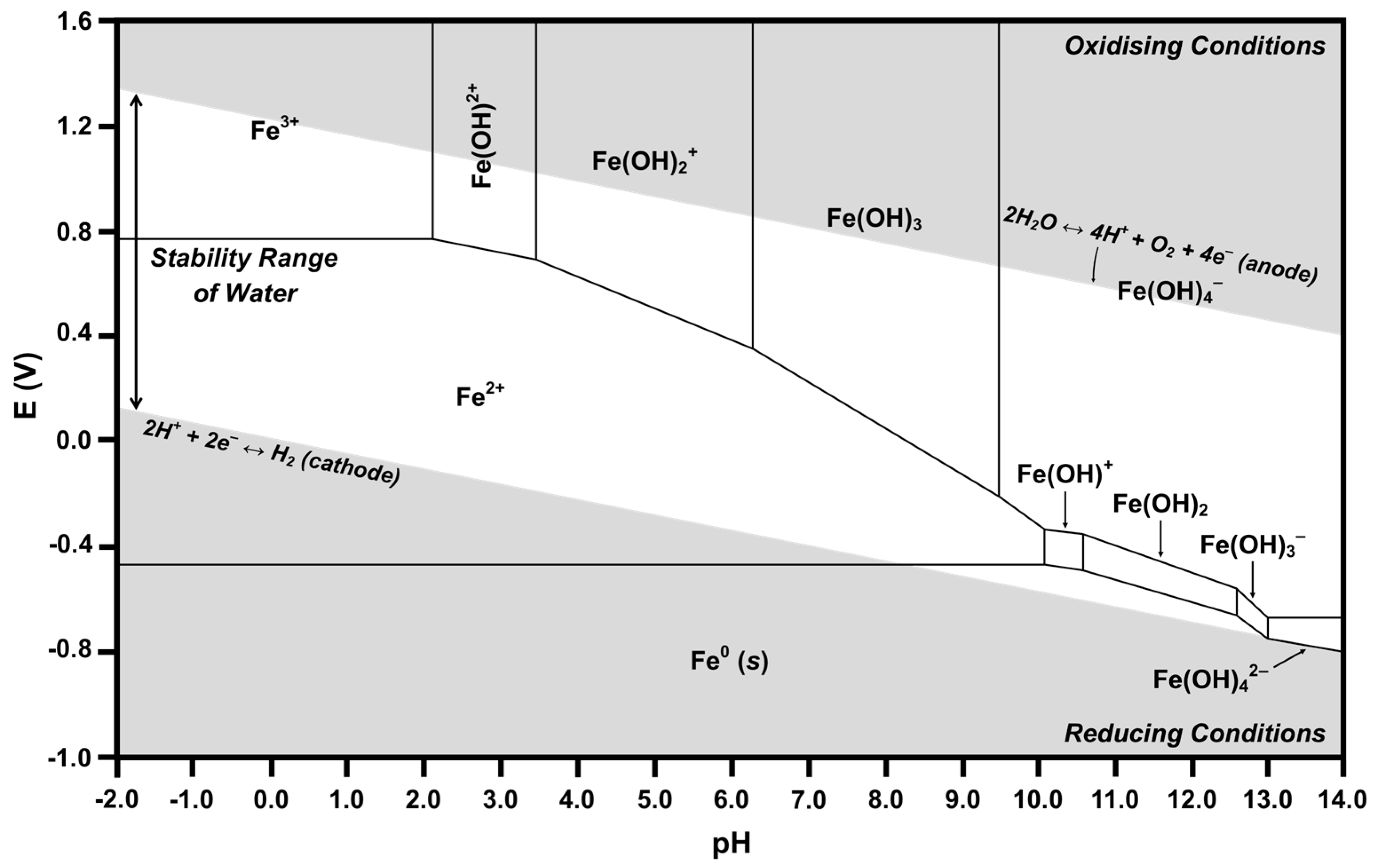 Calculated Pourbaix diagram for Fe-H2O.