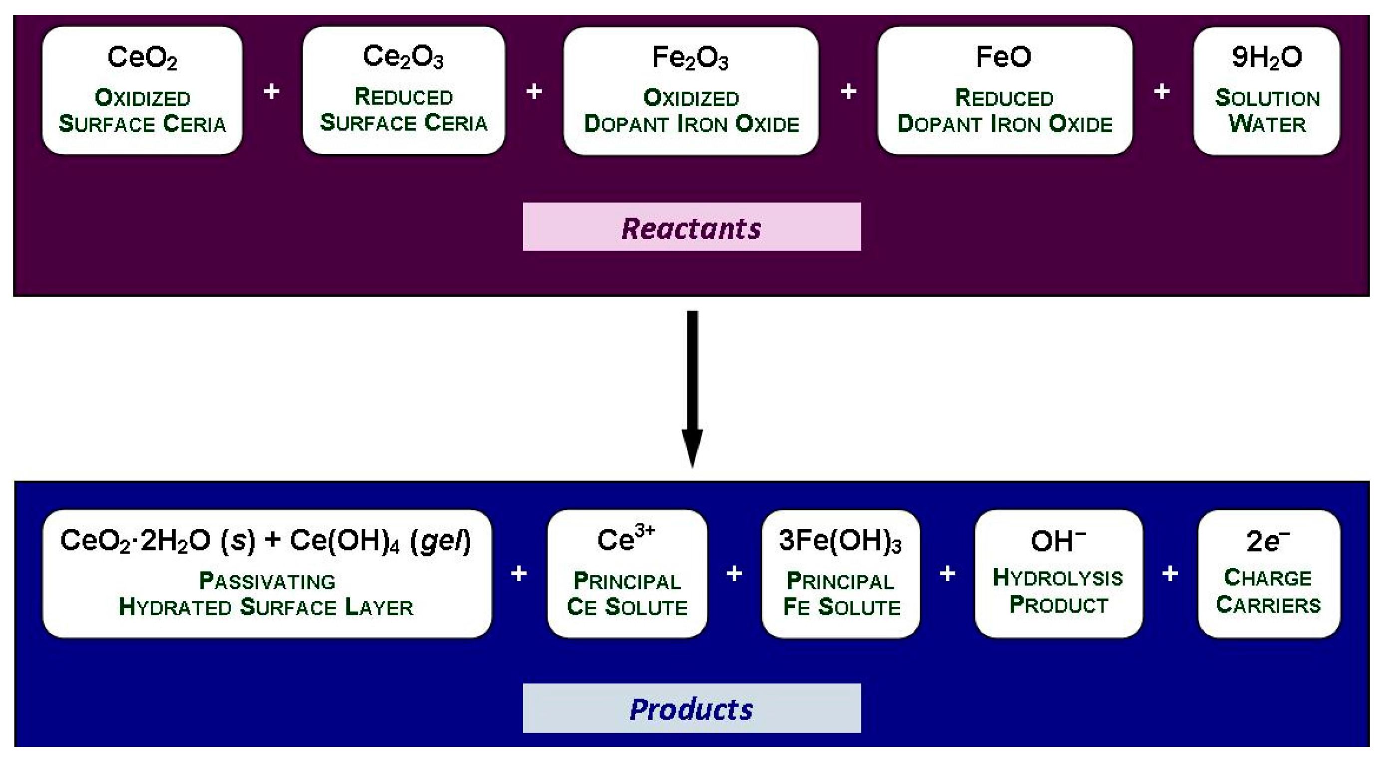 Consequently, the objectives of the present work were to examine: (a) how the surfaces of CeO2 and CeO2 doped with Fe are altered upon exposure to water over a range of pH; (b) the possible ionic and polynuclear species that are thermodynamically able to form upon hydration; and (c) their concentrations in the surrounding solution. These goals were achieved through the generation of the following for Ce- and Fe-containing species:
