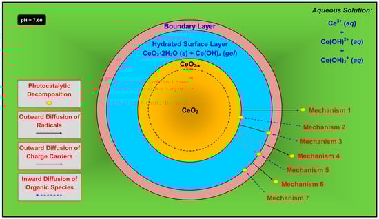 Although the speciation diagrams cover the full range of normal pH (as well as those of extremely high acidity, i.e., at very high species concentrations), the first part of this sequence of publications [8] reported data for the photocatalysis of CeO2 nanoparticles suspended in aqueous solutions in a spiral reactor. Thus, the specific pH of an aqueous suspension of CeO2 was determined by adding 0.1 g of CeO2 nanoparticles to 100 mL of H2O, magnetically stirring the solution, and monitoring the pH until a constant value was attained (which occurred within 48 h). This was found to yield a pH of 7.60. This procedure was repeated for the sample containing the nominal Fe dopant level of 2.00 mol % (1.73 mol % measured) and the variation was minor, yielding a pH of 7.47.