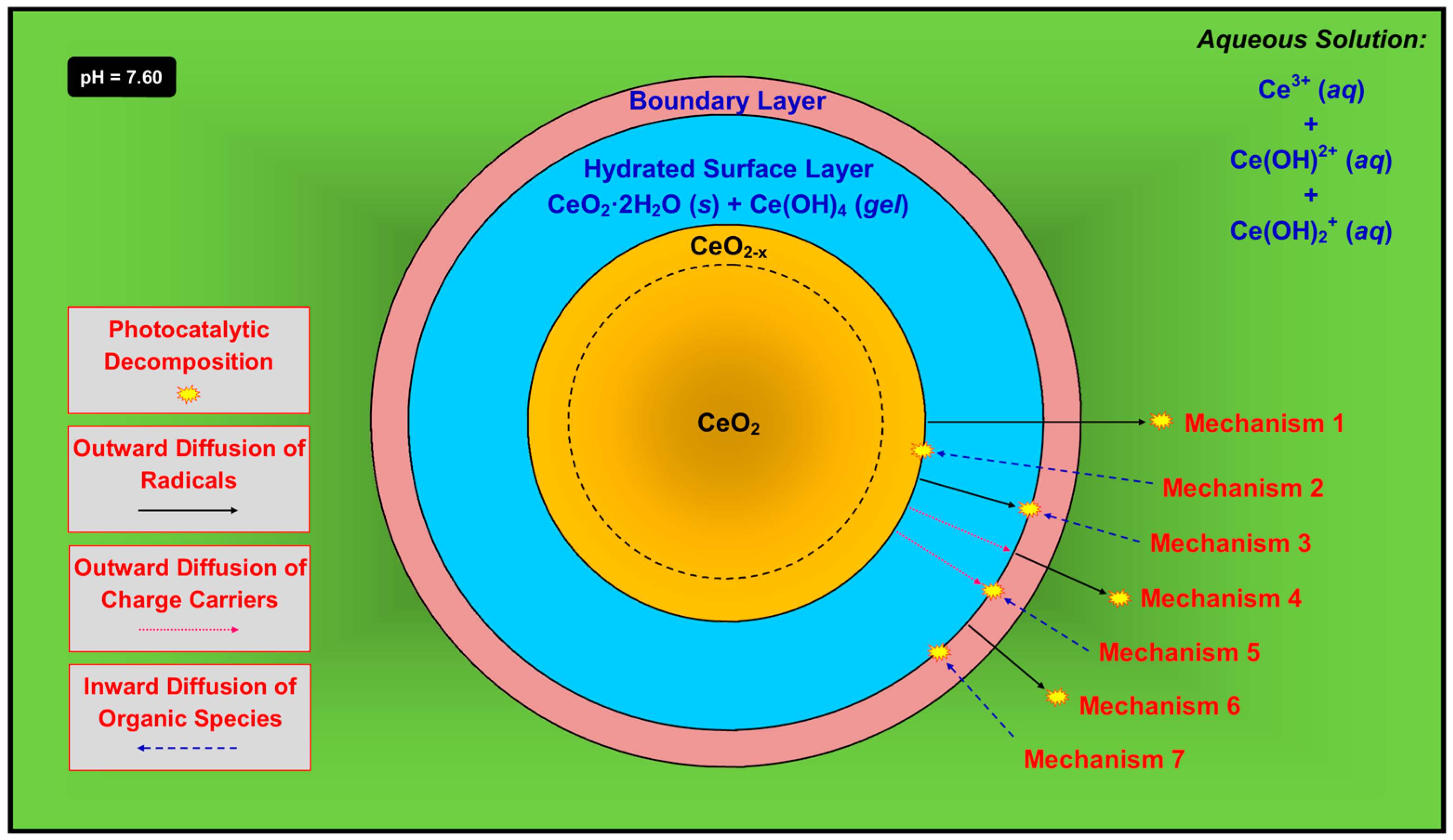 The present work describes the effects of water on Fe-doped nanoparticulate CeO2, produced by flame spray pyrolysis, which represent a critical environmental issue because CeO2 is not stable in typical atmospheric conditions. It is hygroscopic and absorbs ~29 wt % water in the bulk when exposed to water vapor but, more importantly, it forms a hydrated and passivating surface layer when immersed in liquid water. In the latter case, CeO2 initially undergoes direct and/or reductive dissolution, followed by the establishment of a passivating layer calculated to consist of ~69 mol % solid CeO2·2H2O and ~30 mol % gelled Ce(OH)4. Under static flow conditions, a saturated boundary layer also forms but, under turbulent flow conditions, this is removed. While the passivating hydrated surface layer, which is coherent probably owing to the continuous Ce(OH)4 gel, would be expected to eliminate the photoactivity, this does not occur. This apparent anomaly is explained by the calculation of (a) the thermodynamic stability diagrams for Ce and Fe; (b) the speciation diagrams for the Ce4+-H2O, Ce3+-H2O, Fe3+-H2O, and Fe2+-H2O systems; and (c) the Pourbaix diagrams for the Ce-H2O and Fe-H2O systems. Furthermore, consideration of the probable effects of the localized chemical and redox equilibria owing to the establishment of a very low pH (<0) at the liquid-solid interface also is important to the interpretation of the phenomena. These factors highlight the critical importance of the establishment of the passivating surface layer and its role in photocatalysis. A model for the mechanism of photocatalysis by the CeO2 component of the hydrated phase CeO2·2H2O is proposed, explaining the observation of the retention of photocatalysis following the apparent alteration of the surface of CeO2 upon hydration. The model involves the generation of charge carriers at the outer surface of the hydrated surface layer, followed by the formation of radicals, which decompose organic species that have diffused through the boundary layer, if present.