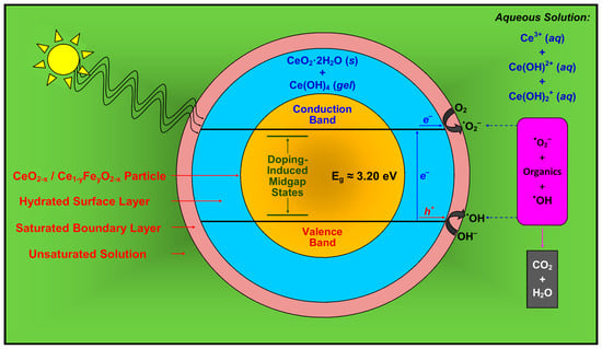 Ceria (CeO2) is well known as a photocatalyst and Fe doping of CeO2 improves its photocatalytic performance [1,2,3,4]. However, it is less well known that, in common with many rare earth oxides [5,6], CeO2 is hygroscopic and hence water can be absorbed upon exposure to atmospheric water vapor. A second potential outcome of this water absorption is the conversion from the oxide to a hydrated and/or hydroxylated phase at the surface [7], particularly upon exposure to liquid water. The present work shows that nanoparticulate CeO2 (~6 nm) exhibits weight gains from the absorption of water vapor in the range ~29–34 wt % when doped with 0–2 mol % Fe (metal basis), respectively. Despite the associated alteration of the CeO2 bulk and surface, where photocatalysis takes place, the presence of a potentially coherent hydrated and/or hydroxylated phase on the surface allows the maintenance of the photocatalytic activity. The present work, which follows previous work on the fabrication, analyses, and photocatalytic performance of Fe-doped CeO2 nanopowders [8], considers the nature of this surface layer when CeO2 is immersed in liquid water and the soluble species associated with it.