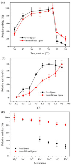 - Xu, L.; Ke, C.; Huang, Y.; Yan, Y. Immobilized Aspergillus niger lipase with SiO2 nanoparticles in sol-gel materials. Catalysts 2016, 6, 149. [Google Scholar] [CrossRef]