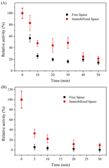- Ren, Y.; Rivera, J.; He, L.; Kulkarni, H.; Lee, D.K.; Messersmith, P. Facile, high efficiency immobilization of lipase enzyme on magnetic iron oxide nanoparticles via a biomimetic coating. BMC Biotechnol. 2011, 11, 63. [Google Scholar] [CrossRef] [PubMed]