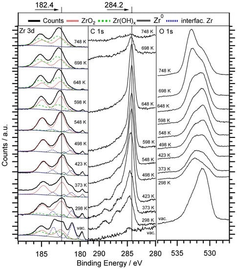 Starting from a partially reduced initial Zr state (CVD with ZTB followed by vacuum annealing []), Figure 2 shows the temperature-dependent evolution of the in situ XPS spectra under MSR conditions. Up to 423 K, carbon oxygenate species can be seen at binding energies around 286–288 eV. They arise from partial oxidation of methanol and prove the potential of the surface for methanol activation. Up to 548 K no Zr hydroxylation is found. With increasing temperature, hydroxylation takes place under reaction conditions, along with a shift of the Zr 3d peak from 182.3 up to 183.0 eV due to reaction with H2O in the gas feed. This indicates water activation and suggests the opening of water activation-dependent reaction channels. Moreover, graphitic carbon species (BE of 284.2 eV) are increasing between 298 and 648 K under MSR conditions. These carbon species disappear at higher temperatures. Both carbon bulk dissolution in Pd and the water gas reaction C + H2O → CO + H2, which can cause the onset of CO formation above 623 K (see Figure 3), may be considered to explain this observation. In the O 1s region, special care has to been taken when interpreting the peak shift to higher BE as Zr hydroxylation, since also carbon oxygenates may contribute to this trend and O 1s overlaps with Pd 3p.