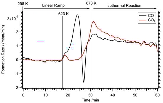 As mentioned above, neither the CVD-as-grown Pd/Zr+4OxHy nor the mixed valence Pd/Zr0/ZrOxHy model catalyst (prepared by vacuum annealing of the former) showed synergistic MSR effects in the standard temperature range up to 623 K. This range represents also the accumulation and stability region of surface/interface carbon species, as verified by the in situ XPS experiments of Figure 2. As the spectra at T > 648 K in Figure 2 both indicate additional surface hydroxylation by water and pronounced carbon clean-off, high-temperature MSR experiments up to 873 K were additionally performed and are shown in Figure 3. Formation of CO starts around 623 K and is assigned to the intrinsic methanol dehydrogenation activity of the residual clean Pd surface. On the initially clean Pd foil (without Zr), this reaction starts also slightly above 600 K. At ~700 K the CO formation rate passes through a maximum, then drops steeply and even becomes negative, i.e., already formed CO is consumed, which is clearly linked to simultaneous positive CO2 formation. It is rather conclusive that the CO2 formation arises from the onset of water gas shift (WGSR) activity, which is again coupled with the pronounced carbon clean-off effect starting above 650 K and shown in Figure 2. Thus, we suggest a water activation—carbon clean off—WGSR scenario mediated by “de-coked” and hence, activated Pd/ZrOxHy sites above ~650 K. The catalytic results of Figure 3 are therefore consistent with the in situ XP spectra of Figure 2. In the isothermal reaction part, CO is still formed on Pd, but partially re-consumed by the water gas shift reaction to form CO2. Consequently, both formation rates, CO and CO2, are positive. On this basis, we have to conclude that the low-temperature coking tendency, the high water-activation temperature and the CO2-forming WGS reaction on the “re-activated” catalyst limit the relevance of Pd/ZrOxHy for highly selective MSR applications, which are intrinsically impossible due to the temperature-dependent WGS equilibrium.