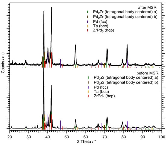 XRD patterns of the Pd-Zr system with a nominal starting stoichiometry of Pd:Zr = 2:1 before (lower panel) and after (upper panel) methanol steam reforming up to 873 K.