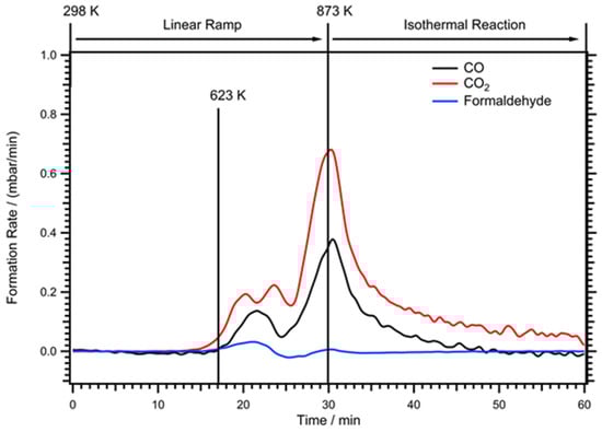 Figure 6 shows that, despite the obvious bulk structural leniency of the system, on the Pd-Zr bulk system, water-activating sites must also be in principal available, as a pronounced CO2 formation rate is observed. The catalytic light-off temperature of CO2 and CO at approximately 623 K is very well comparable to that of the inverse Pd/ZrOxHy sample (cf. Figure 3), with the CO2 formation rate increasing already slightly below 623 K. As on Pd/ZrOxHy, low-temperature CO2 and CO maxima are observed before the maximum formation rate of both CO2 and CO is approached around 873 K, again very comparable to Pd/ZrOxHy. Formation of formaldehyde is also observed, but at a very low rate. Overall, it is worth noting that the catalytic profiles of the inverse Pd/ZrOxHy and the intermetallic Pd-Zr sample are qualitatively very well comparable at least with respect to the CO and CO2 rate maxima.