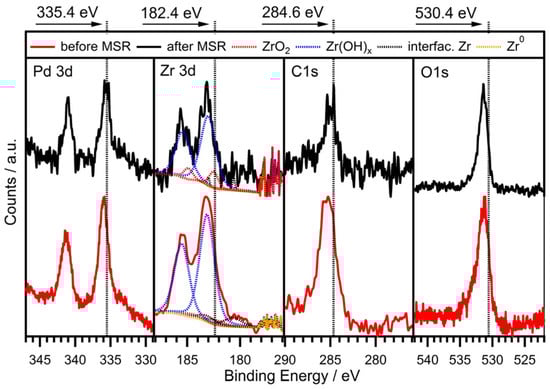 Ex situ XP spectra of the Pd-Zr system with nominal starting stoichiometry of Pd:Zr = 2:1 before and after the MSR reaction up to 873 K (reaction details cf. Figure 6). The Pd 3d, Zr 3d, C 1s and O 1s signals are shown in separate panels.