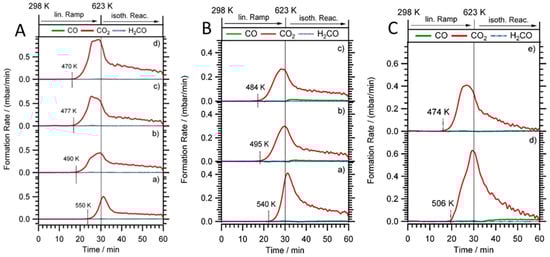 Methanol steam reforming on the initial Cu-Zr metal-intermetallic compound catalysts. (A) Cu:Zr stoichiometry = 2:1, (a–d) four subsequent runs on the same starting material. Note that the decrease of CO2 formation rate during the isothermal reaction is due to progressive reactant consumption (methanol conversion after 60 min ~100% for (d)); (B) Catalysis data: (a) for run 1; (b) for run 2; and (c) for run 3 on a Cu/Zr catalyst with the initial ratio Cu:Zr = 9:2; (C) (d,e) runs 1 and 3 for an initial ratio Cu:Zr = 1:2.