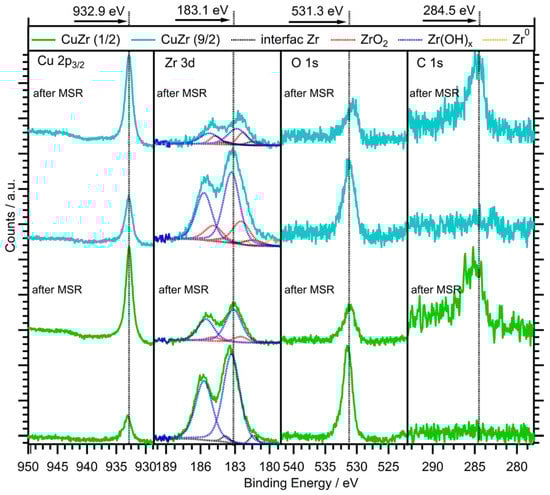 Ex situ collected XP spectra before and after the methanol steam reforming reaction on the Cu-Zr samples with Cu excess (nominal Cu:Zr stoichiometry = 9:2, green traces) and Zr excess (nominal Cu:Zr stoichiometry = 1:2, turquoise traces). The Cu 2p, Zr 3d, O 1s and C 1s signals are shown in separate panels.