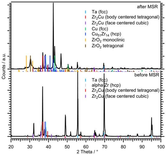 XRD analysis of the Cu-Zr sample with a nominal Cu:Zr = 1:2 stoichiometry: before MSR (lower panel); and after MSR (upper panel).