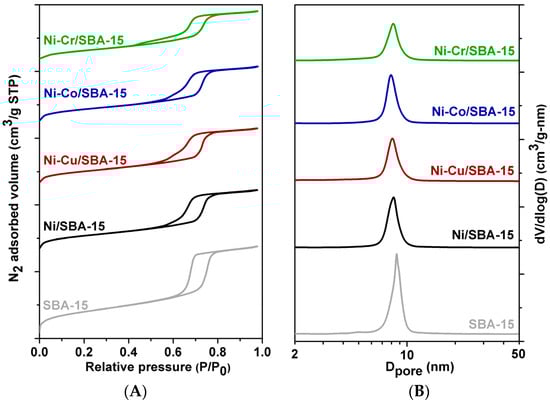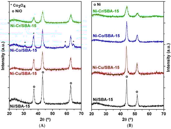Figure 3A shows the high-angle XRD patterns of calcined catalysts. Characteristic peaks of NiO appear at 2θ = 37.3°, 43.3°, 62.9°, 75.5°, and 79.5° (JCPDS 78-0643). Furthermore, in the case of Ni-Co/SBA-15 catalyst, small peaks are also observed at 2θ = 31.3°, 36.9°, 44.8°, 59.4°, and 65.2°, indicating the presence of Co3O4 crystallites (JCPDS 42-1467). For Ni-Cr/SBA-15 and Ni-Cu/SBA-15 samples, peaks corresponding to Cr and Cu oxides are absent due to both the good dispersion of these metals in the catalysts and the detection limit of the crystal size provided by this technique, as observed elsewhere for similar materials [20,35]. Moreover, comparing the XRD patterns of the different catalysts, it is observed that NiO peaks in Ni/SBA-15 sample are more intense than in the catalysts doped with Co, Cr, or Cu, indicating that Ni crystallites are smaller in the modified catalysts.