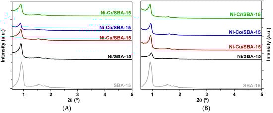 Figure 2. Small-angle X-ray diffraction of SBA-15 support and the Ni-(Cu,Co,Cr)/SBA-15 catalysts: (A) calcined; and (B) reduced.