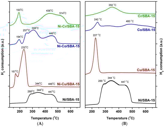 Figure 5. TPR profiles: (A) Ni-(Cu,Co,Cr)/SBA-15 catalysts; and (B) monometallic samples.