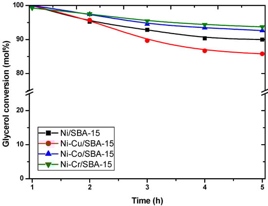 On the contrary, the Ni-Cu/SBA-15 catalyst achieved the lowest hydrogen production, since the addition of Cu to Ni-based catalysts can interfere with Ni availability on the surface of the material, thus hindering the Ni activity [38]. As a consequence, higher amounts of intermediate products (CH4 and CO) and lower amounts of final products (CO2 and H2) could be found for this sample. Both beneficial and unfavorable effects on the reforming activity have been published for the incorporation of Cu to Ni-based catalysts, depending on the Cu loading [19,20,39]. Despite the higher glycerol conversion, the Ni-Co/SBA-15 catalyst led to lower hydrogen content in the gas stream than the Ni/SBA-15 sample, which may be ascribed to the lower capacity of Co than Ni for breaking C–C bonds [17].