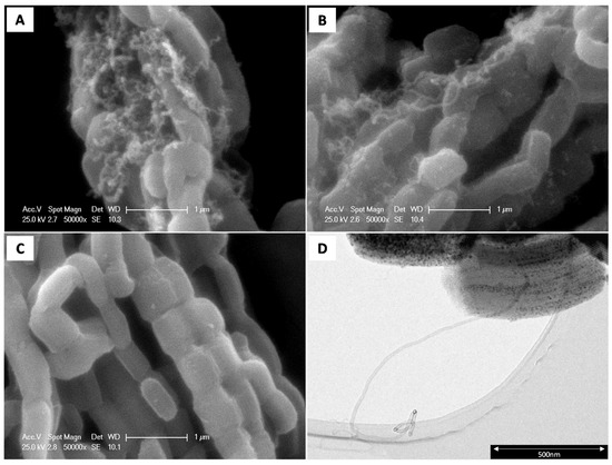 Figure 7. Micrographs of the bimetallic catalysts after 5 h on-stream under reaction conditions. SEM images: (A) Ni-Cu/SBA-15; (B) Ni-Co/SBA-15; and (C) Ni-Cr/SBA-15. TEM image: (D) Ni-Cr/SBA-15.