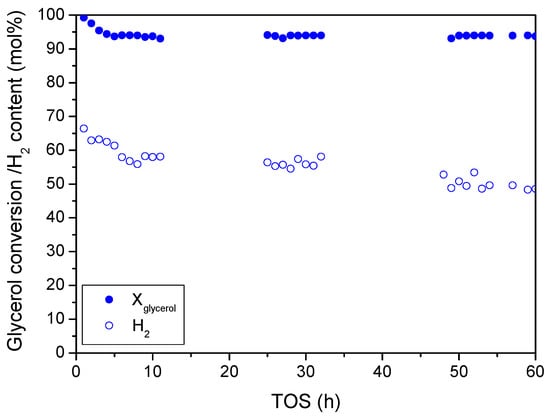 Finally, taking into account that the best results in terms of glycerol conversion and hydrogen production with reduced coke formation were obtained with the Ni-Cr/SBA-15 catalyst, a stability test was performed with this catalyst under the same operating conditions for 60 h. The evolution of glycerol conversion and hydrogen production with TOS are shown in Figure 8. Glycerol conversion above 93% was maintained after 60 h on stream, indicating relatively good stability of Ni-Cr/SBA-15 sample. However, the hydrogen content in the gas outlet stream decreased with time to reach an almost constant value around 49 mol %.