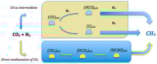 The first and most popular path considers the conversion of CO2 to CO, which, in turn, is hydrogenated to CH4 by the same mechanism involved in CO methanation. The second path includes the direct hydrogenation of CO2 to CH4, without formation of any CO intermediate (Figure 2). As said above, numerous reviews exist on this argument (i.e., mechanistic aspects, reactor type modeling, simulation); therefore, it is outside the scope of the present paper [10,11].