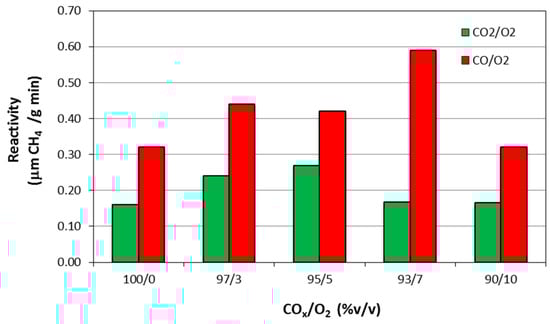 The presence of O2 could have a positive effect on the methanation of CO2 and CO. Belus et al. highlighted that oxygen, in low proportion, improves the catalytic performance of the Rh/γ-Al2O3 catalyst, but if the amount of O2 is too high, a negative effect is observed [31]. In Figure 3 the methane production, over Rh(1%)/γ-Al2O3 catalyst, at 125 °C, as a function of CO/O2 and CO2/O2 is reported. DRIFTS experiments explain that the positive effect of oxygen is due to the formation of more active species, such as gem-dicarbonyl. On the contrary, the negative effect could be attributed to the inevitable oxidation of the catalyst [31].