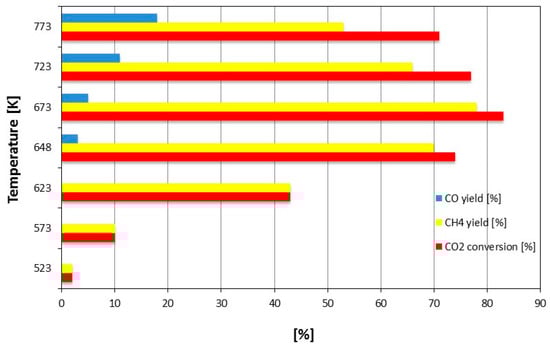 Ru is one of the most active methanation catalysts. Its catalytic activity and selectivity to CH4 are, however, largely dependent on the dispersion of the metallic phase (at high dispersion the apparent activation energy reaches a minimum), on the type of the support, and an addition of modifiers/promoters that can more or less chemically interact with the metal [45,46,47,48,49,50,51,52,53,54]. Ru catalysts have been supported on a number of oxide materials, such as Al2O3, TiO2, SiO2, MgO, MgAl2O4, C, and Ce0.8Zr0.2O2 [55,56]. The activity of pre-reduced 3%Ru/Al2O3 catalyst (CO2 conversion, CH4 and CO yields), as a function of the reaction temperature, is reported in Figure 4 [53]. The best catalytic performance occurs at 673 K, with the highest CO2 conversion, CH4 yield, and limited CO yield.