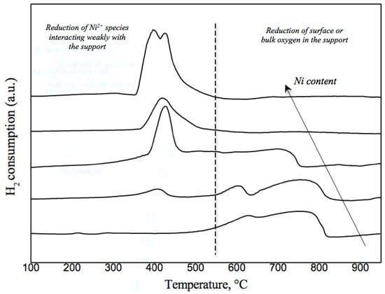 The H2–TPR profiles reported in [180] show peaks in the temperature range from 400 °C to 600 °C for CZ, attributed to a reduction of surface oxygen and bulk oxygen in Ce0.5Zr0.5O2, respectively [42,181,182], while the peaks around 360 °C are assigned to the reduction of surface oxygen in CZ and of the bulk NiO, having weak interaction with the support. Peaks at 400–600 °C are related to bulk oxygen in CZ and NiO having strong interaction with the support, or Ni ions incorporated into CZ [183]. In Figure 5 the qualitative behavior of TPR profiles (the data from our research are not yet published) of nickel catalysts supported on doped ceria with increasing nickel content is reported.