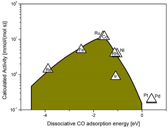 From 2004 to 2007 an interesting series of papers appeared in the literature [206,207,208,209] that, starting from fundamental concepts of heterogeneous catalysis, were applied by the authors to the methanation reaction. According to [210], one of the fundamental results is the well-known volcano curve. This is obtained when the activity of catalysts, for a given reaction, is plotted as a function of a parameter related to the ability of the surface to form chemical bonds with reactants, intermediates, or products [211,212].
