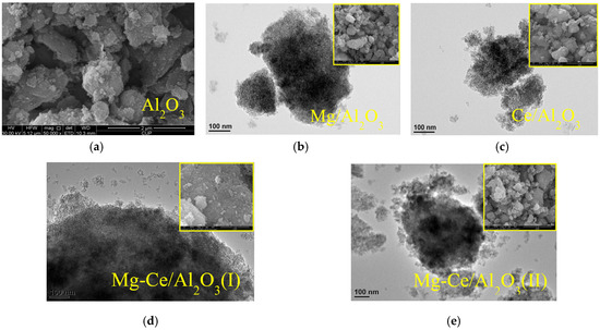Scanning electron microscope (SEM) image of Al2O3 substrate (a) and transmission electron microscope micrographs of loaded Al2O3 with inset SEM images: (b) Mg/Al2O3; (c) Ce/Al2O3; (d) Mg-Ce/Al2O3 (I); (e) Mg-Ce/Al2O3 (II).