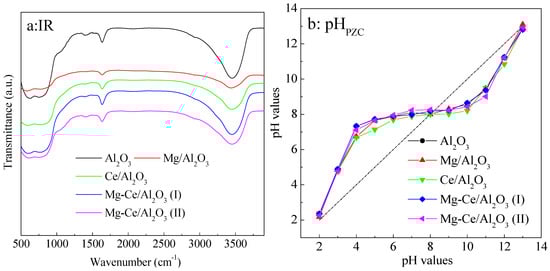 Infrared (IR) spectra (a) and pHpzc values (b) of Al2O3 and metal oxide-loaded Al2O3 catalysts.