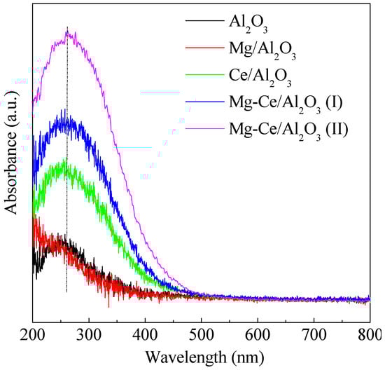 Figure 5 illustrates the UV-vis spectra for the prepared catalysts. Al2O3 showed an absorption peak at around 260 nm. Mg/Al2O3 exhibited a strong absorption centered at 200 nm and a wider low-intensity absorption profile at 220–380 nm. The large initial absorption peak is associated with micro-aggregates from highly dispersed Mg2+ on the Al2O3 surface and the lower broad profile due to the Al2O3 substrate [12]. Ce/Al2O3 had a broad 200–380 nm absorption profile with a peak at 260 nm, which can be associated with overlapping transitional charge transfers that occur between O2− → Ce4+ [39]. Mg-Ce/Al2O3 (I) and Mg-Ce/Al2O3 (II) both exhibited stronger absorption profiles between 200 and 380 nm and had a similar peak at 260 nm, which can be attributed to increased concentrations of deposited metal oxides and also to the interactions between them.