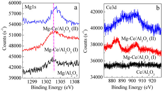 Figure 6a presents the Mg1s spectra of catalysts based on X-ray photoelectron spectroscopy (XPS). The binding energy of Mg1s from Mg2+ oxides was centered at 1303 eV [40]. The asymmetrical distribution of the Mg1s peak for Mg/Al2O3 was likely due to strong interactions between Mg and the Al2O3 support. For Mg/Al2O3, the surface content of MgO (0.71 wt %) was greater than the bulk content (0.30 wt %), suggesting surface enrichment. Mg-Ce/Al2O3 (I) displayed a similar Mg1s peak compared to Mg/Al2O3, having only a slight influence of Mg and Al2O3 interactions. The increased intensity of the Mg1s peak for Mg-Ce/Al2O3 (I) suggests that the surface distribution of Mg was enhanced through the introduction of Ce. The surface content of MgO (0.78 wt %) for Mg-Ce/Al2O3 (I) was higher than that (0.71 wt %) for Mg/Al2O3. Mg-Ce/Al2O3 (II) showed a symmetrical distribution of the Mg1s peak relative to Mg/Al2O3 and Mg-Ce/Al2O3 (I), suggesting a reduction of the Mg and Al2O3 interaction. The surface content of MgO for Mg-Ce/Al2O3 (II) was 0.75 wt %, similar to those of Mg/Al2O3 (0.71 wt %) and Mg-Ce/Al2O3 (I) (0.78 wt %), although the loading of MgO of the former was three-fold of the latter. This demonstrates that greater concentrations of MgO exist in bulk rather than being highly dispersed on the surface of Mg-Ce/Al2O3 (II).