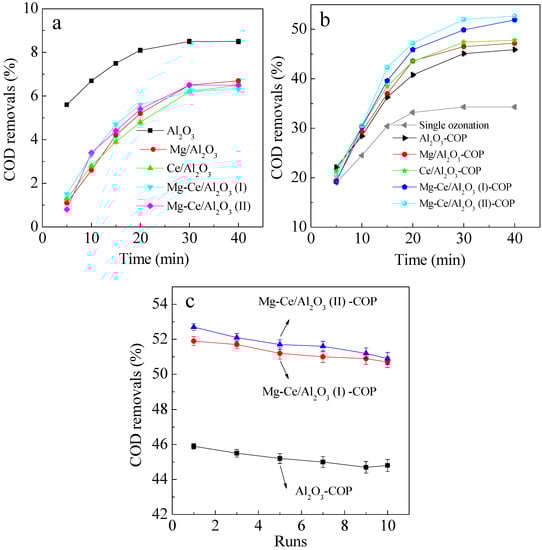 COD removals for RPRW by adsorption (a); by single ozonation and COPs (b); and by 10 repeated uses of COPs (c) (note: 0.5 g catalyst, 5 mg/min ozone, and 30 °C).