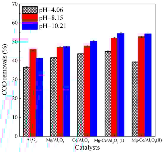 It is believed that active catalytic surfaces can induce ozone to form •OH, accelerating chemical degradation. Surface –OHs on the catalytic surface are known to have an impact during this process [42,43,44]. Solution pH values near the pHpzc of a catalyst can result in accelerated •OH generation [45]. Initial pH values (about 4.06, 8.15, and 10.21) were examined and found to have a significant impact on COD removal efficiency during COP treatment (Figure 9).