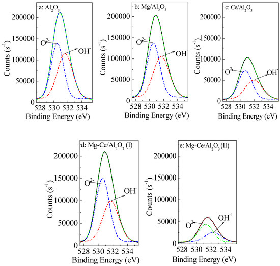 XPS spectra of O1s of Al2O3 and metal oxide-loaded Al2O3 catalysts. (a) Al2O3; (b) Mg/Al2O3; (c) Ce/Al2O3; (d) Mg-Ce/Al2O3 (I); (e) Mg-Ce/Al2O3 (II).