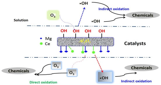 Al2O3-COP was the most efficient at an initial pH value of 8.15, close to its pHpzc value (8.19), due to highly active surface –OHs. The other COPs were the most efficient at an initial pH value of 10.21, away from their pHpzc values (8.1~8.3). This suggests that the active sites on the catalysts were modified due to the introduction of Mg and/or oxides on Al2O3. Mg/Al2O3 and Ce/Al2O3 exhibited higher COD removal efficiency in comparison to Al2O3, despite the lower surface –OHs. This illustrates the increased effect due to an increase in the dispersion of Mg or Ce oxides on the surface. Ce/Al2O3 had lower surface –OHs compared to Mg/Al2O3. Furthermore, the surface molar ratio of Ce3d/Al2p (0.0012) on Ce/Al2O3 was lower than that of Mg1s/Al2p (0.009) on Mg/Al2O3. However, a small increase in efficiency for COD removal using Ce/Al2O3 was observed when compared with Mg/Al2O3, suggesting higher Ce oxide catalytic activity over Mg2+ oxide. The increased COD removal for Mg-Ce/Al2O3 (I) and (II) was due to an enhanced surface distribution of the metal oxides when compared to Mg/Al2O3 and Ce/Al2O3, despite the lower surface –OHs. For Mg/Al2O3, Ce/Al2O3, Mg-Ce/Al2O3 (I) and (II), dispersion of the Ce and/or Mg oxides increased available active sites and accelerated COD removal during the COP treatment. However, the activity contribution from surface –OHs is still important for the COP treatment, especially when the low surface loading of Ce and/or Mg oxides is considered. Therefore, the Ce and/or Mg oxides and surface –OHs likely have a co-functional activity on metal oxide-loaded Al2O3. At an initial pH value of 4.06, Mg-Ce/Al2O3 (II) exhibited low COD removal efficiency, suggesting poor acidic tolerance. For Mg-Ce/Al2O3 (II), interactions between MgO and the Al2O3 support are weak, causing the dissolution of MgO and nearby Ce4+ oxides under these acidic conditions. For Mg/Al2O3, Ce/Al2O3, and Mg-Ce/Al2O3 (I), interactions between the metal oxides and the Al2O3 support are strong, maintaining higher stability. The acid-resistant metal oxide-loaded Al2O3 catalysts exhibited higher COD removal efficiency compared to Al2O3 from an increase in direct oxidation. The metal oxide-loaded Al2O3 catalysts provided a platform for the adsorption of chemicals and/or ozone molecules, resulting in higher reactivities. These are strongly influenced by the surface metal oxide composition, the coordinated environmental distribution, and the interactions between the metal oxides and the Al2O3 support (Figure 11).